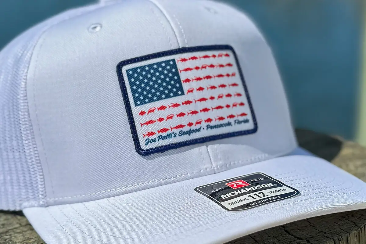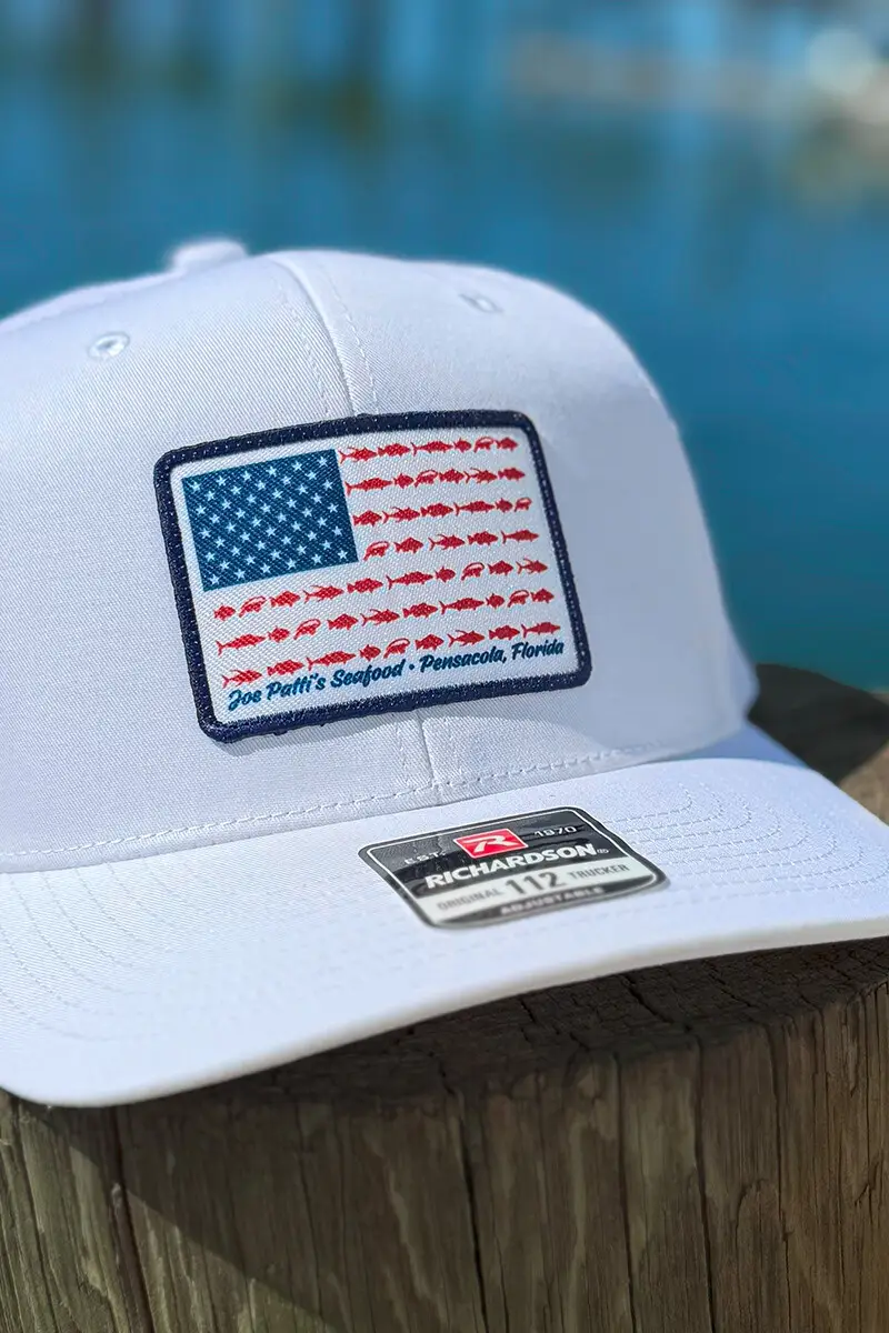 Add some Red, White & Blue to your gear. Tall, Full-Colored Embroidered Flag Logo, White front, white mesh back great for those hot days on the water and you need to block the sun but let your head breathe…Don’t fall for fakes – this is Original Joe Patti’s Gear!